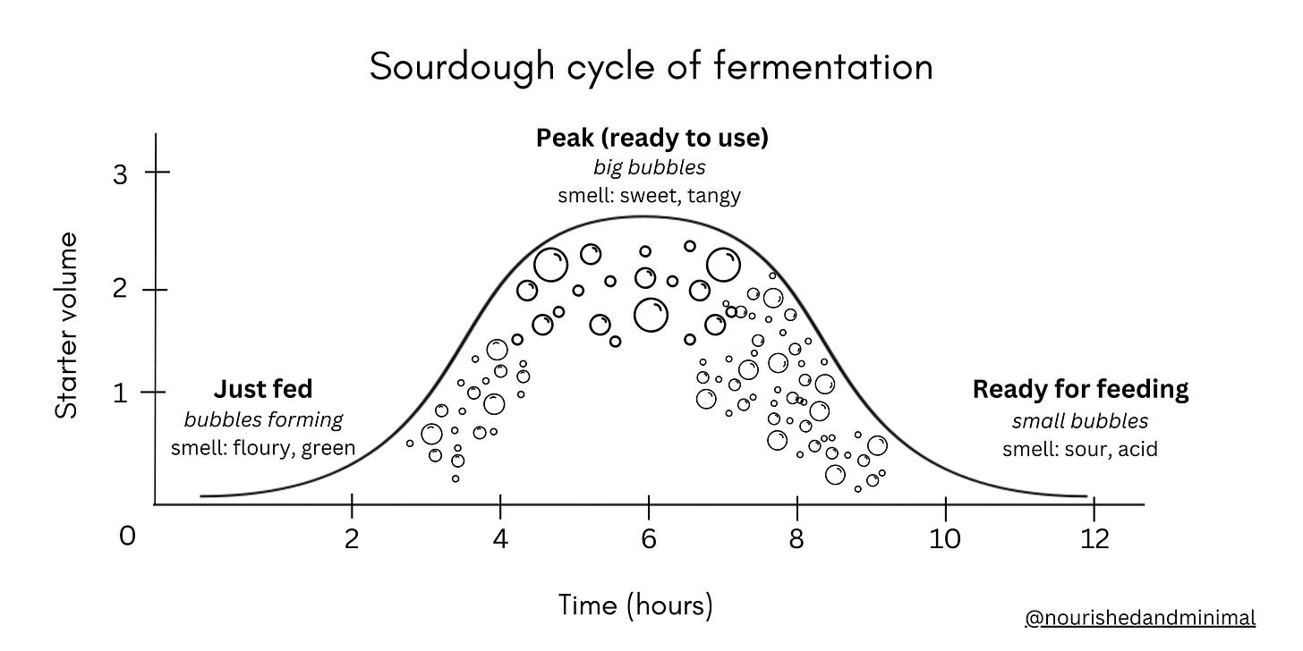 And here’s what a starter looks like at each stage of the sourdough cycle of fermentation: